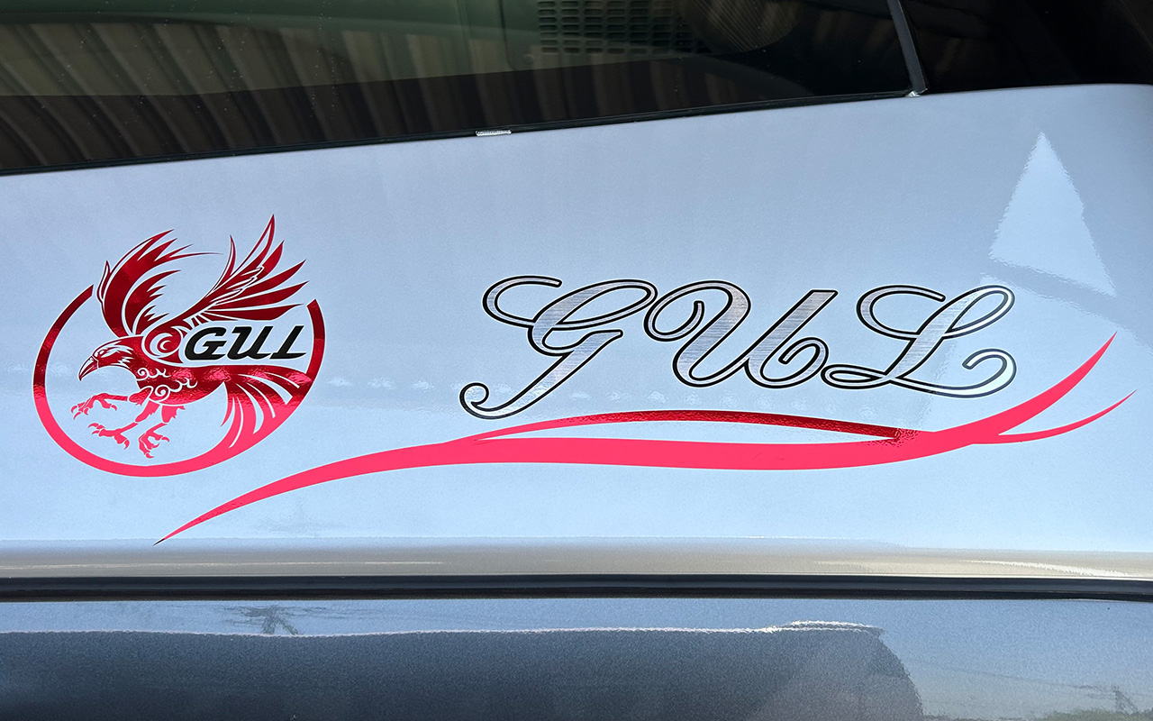 リムジンバスにカッティングシートを施工しました。八咫烏(やたがらす)のマークは、お客様からのリクエストで作成したものです(重ね貼り。三色使用)