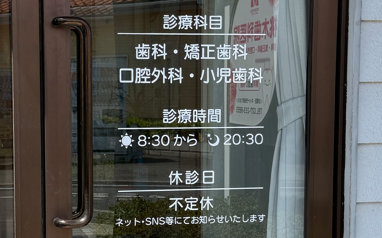 ドアガラスのカッティングシートを作成しました。診療時間や休診日の情報がわかりやすくなりました。